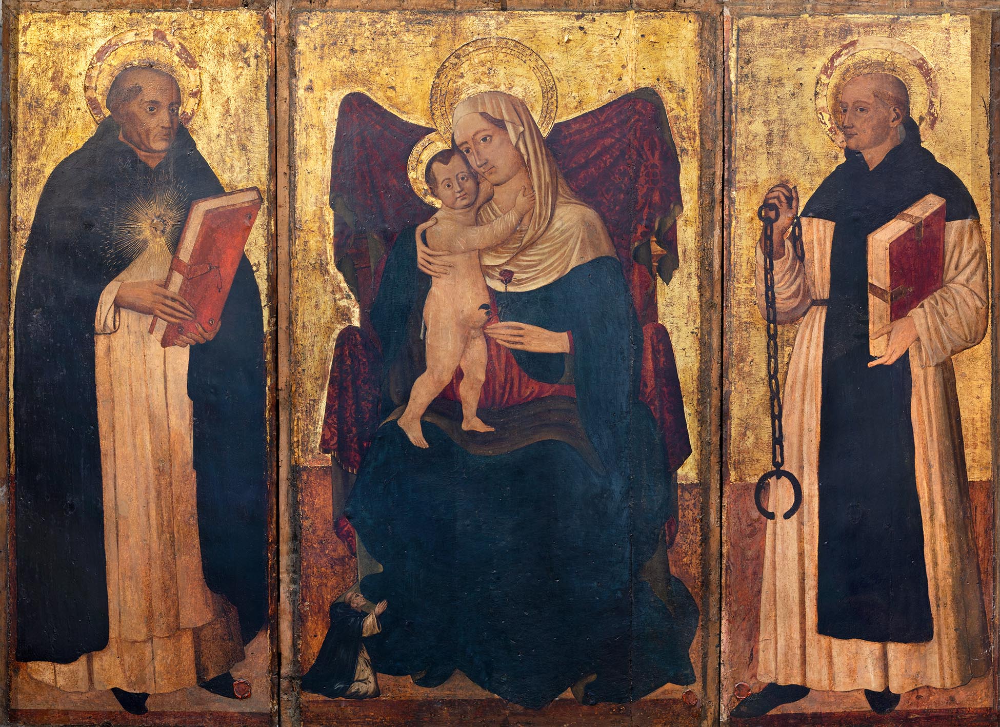 The medieval painting of Madonna and St. Thomas Aquinas in the church Chiesa de San Pietro Martire (Church of St. Peter Martyr) in Italy by an unknown artist of the 15th century.