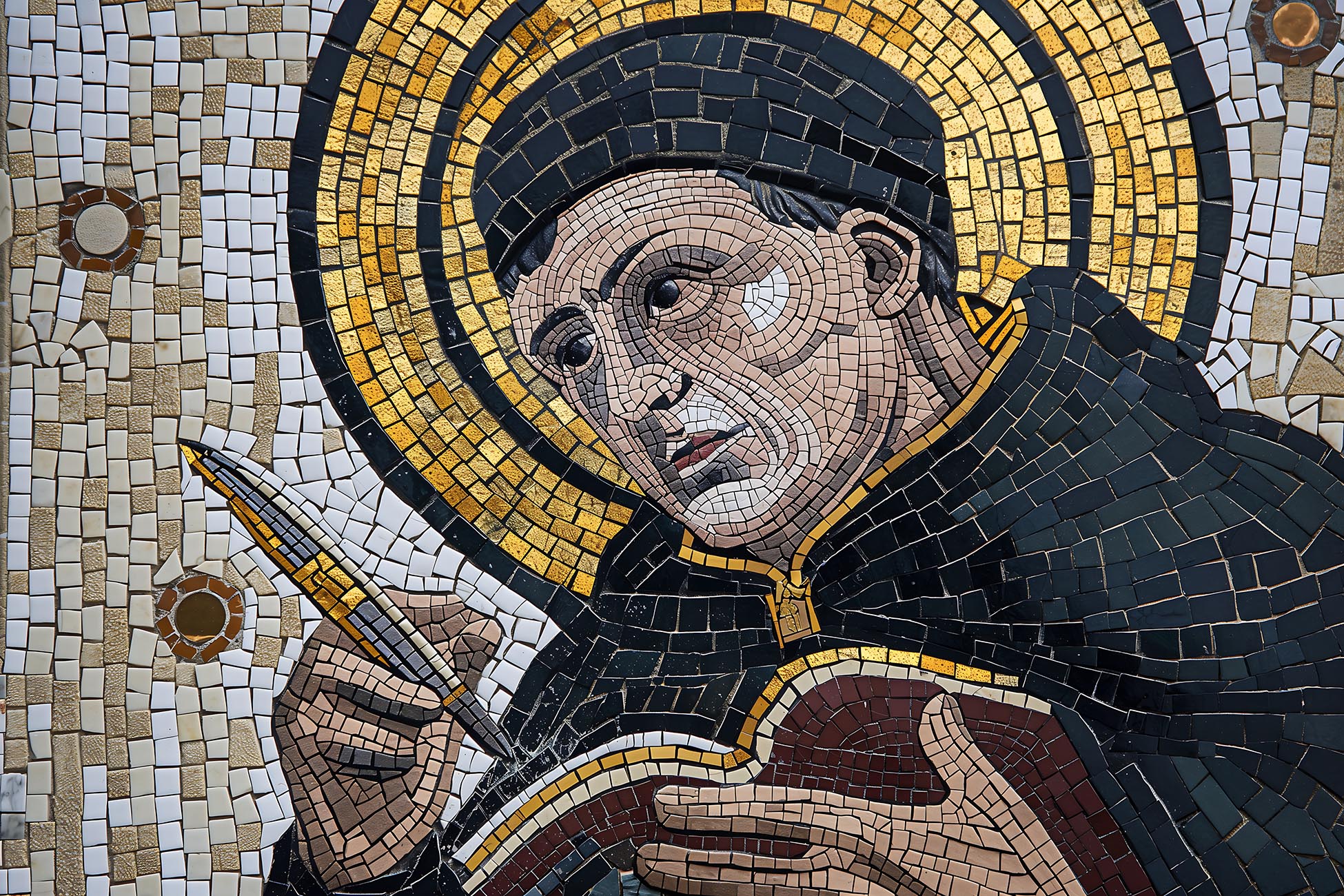 A mosaic depicting St. Thomas Aquinas in his Dominican habit, holding a book and quill pen. Adobe Stock