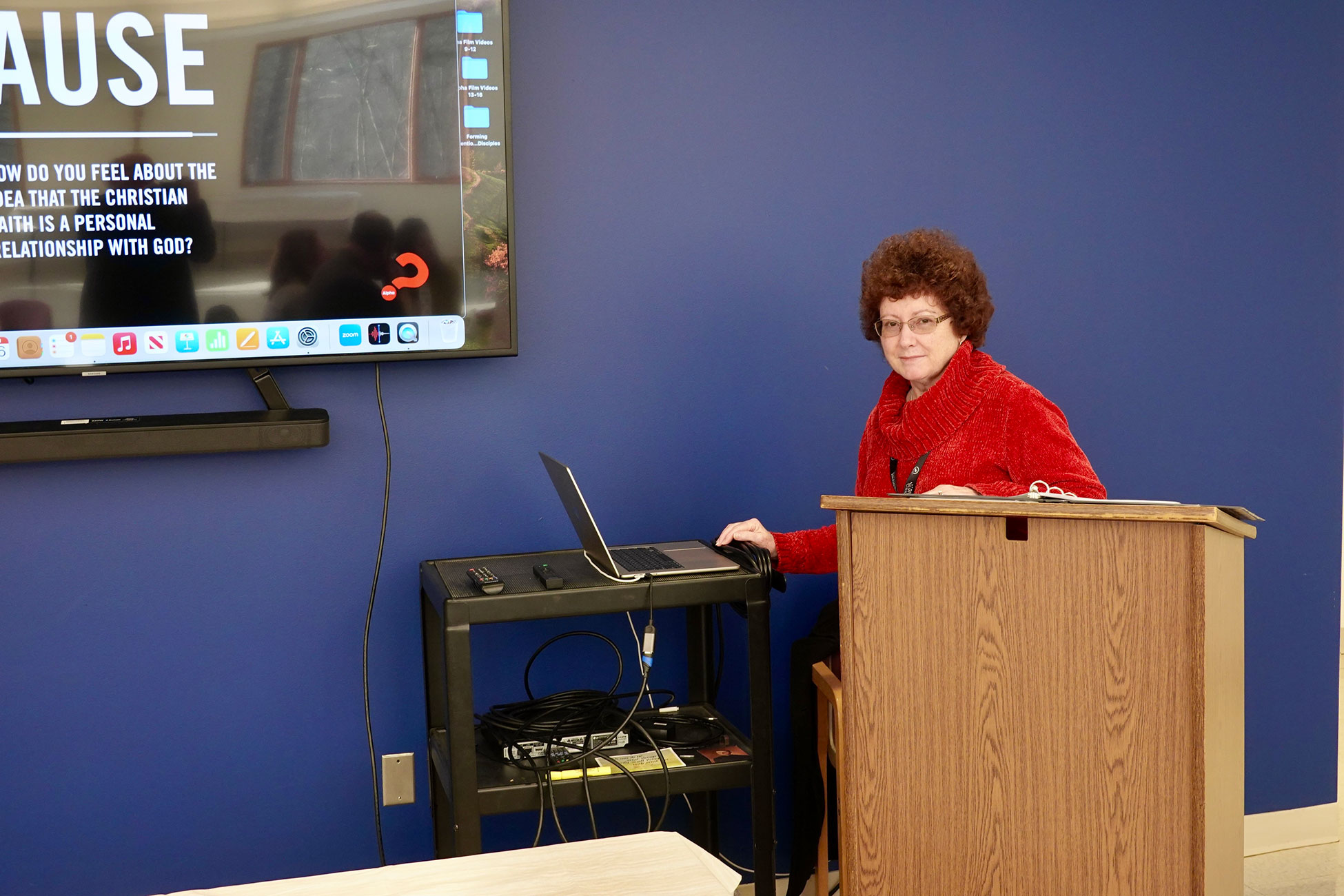 Ann Bodurtha, an Alpha leader shows, the group a video that discusses what faith is.