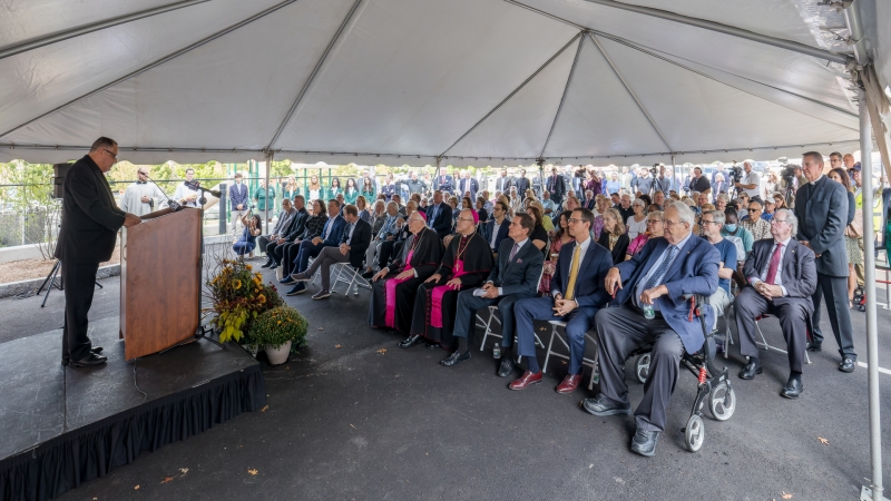 Monsignor James Shanley welcomes supporters of the new Cathedral Community Center. Seated in the front row, fifth from left, is Hartford Mayor Luke Bronin, Archbishop of Hartford Leonard P. Blair, Auxiliary Bishop Juan Miguel Betancourt, Hartford Bishops’ Foundation General Chair James Smith, Malta House of Care Chair Brian Sheehan, and attorney Peter Kelly. Photo by Aaron Joseph