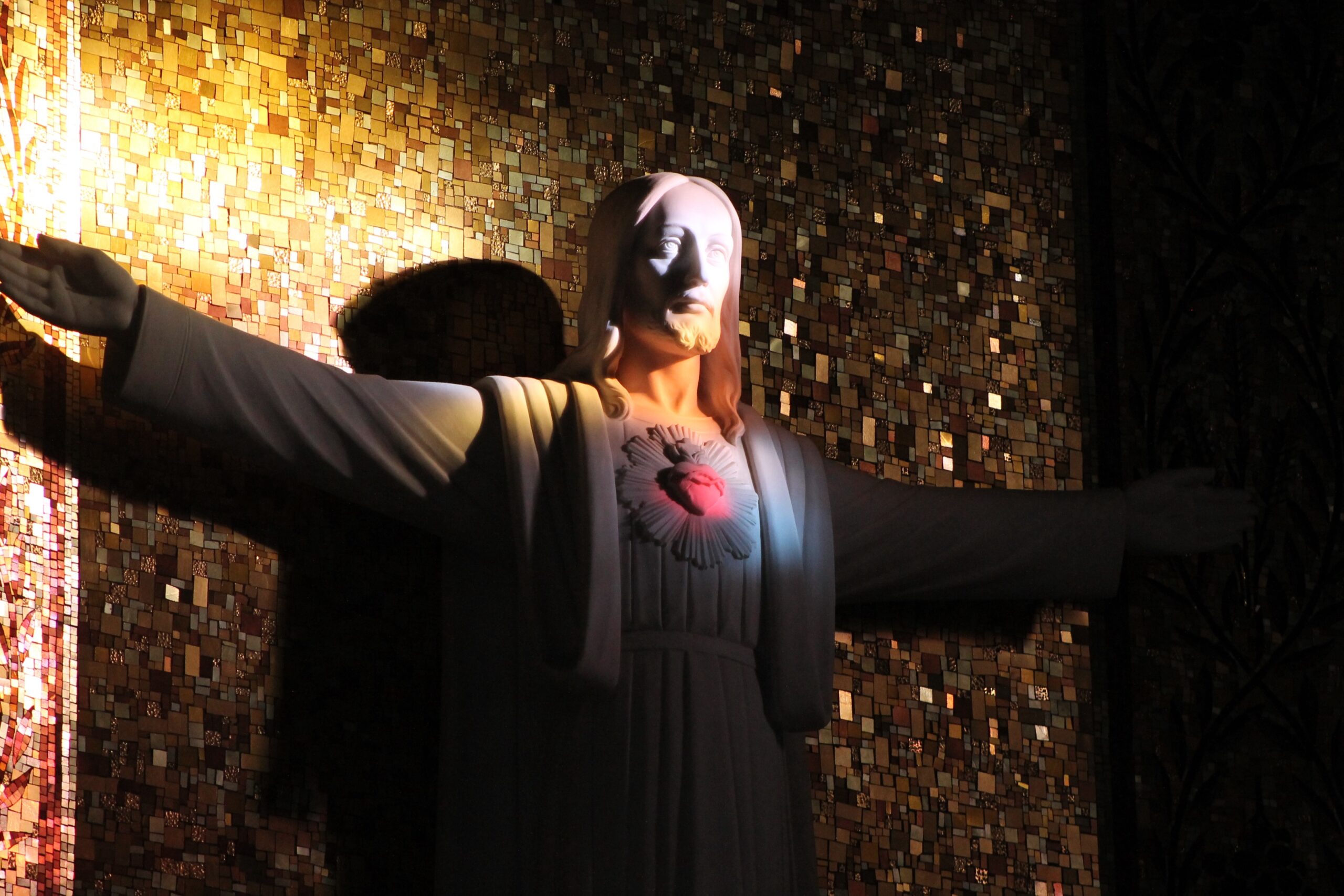 “It’s breathtaking to see,” she says. “It comes through a pane on a western window in the apse of the chapel, where St. Francis Xavier’s name is. You see this reflection moving across the gold mosaic of the sanctuary. There is a red glow, and suddenly in the blink of an eye, a narrow red streak of light completely illuminates the Sacred Heart, and then disappears.”