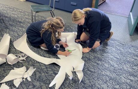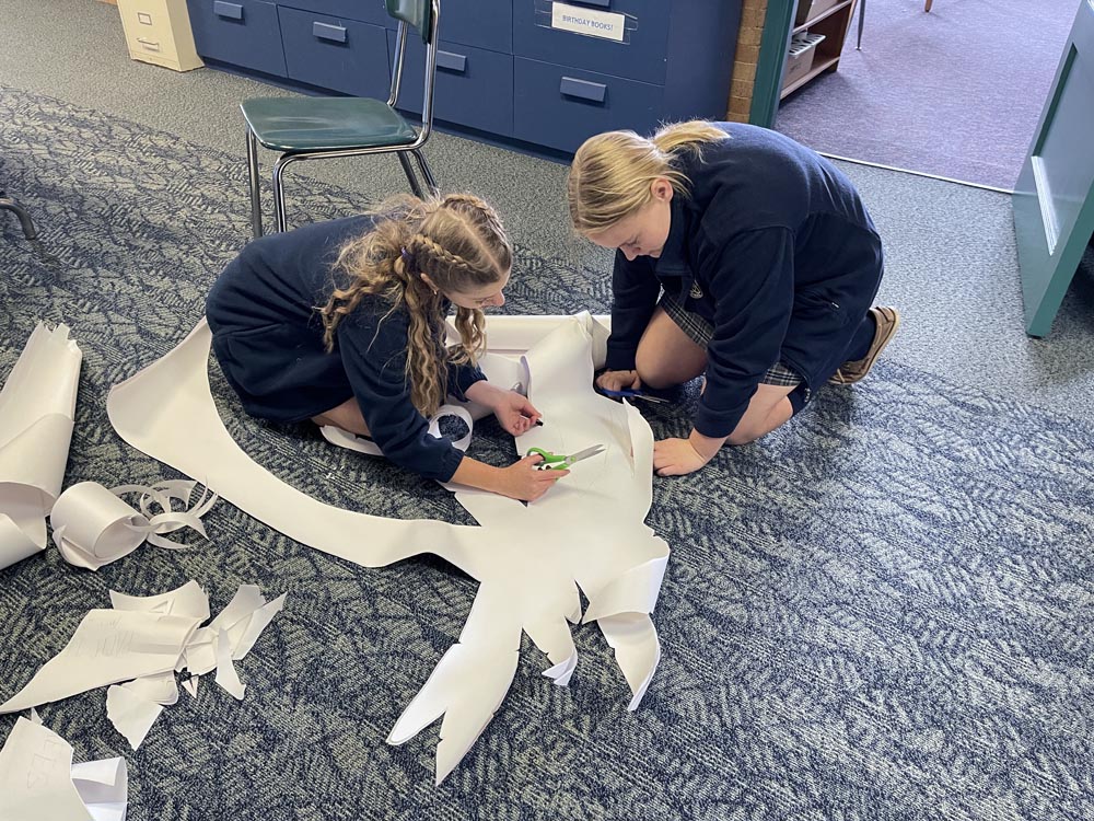 The whole scene is sketched out in advance by Darlene Bailey, a retired teacher who was a teacher at Holy Trinity for 30 years. This year, she partnered with Anne Roth, another retired teacher, who taught at the school for 18 years. Together, they used an overhead projector to project images onto a wall and traced them to create the patterns. The eighth-grade students then used the patterns to trace the images onto white paper, and did the cutting and taping.