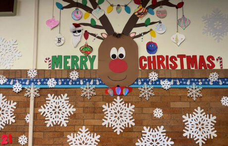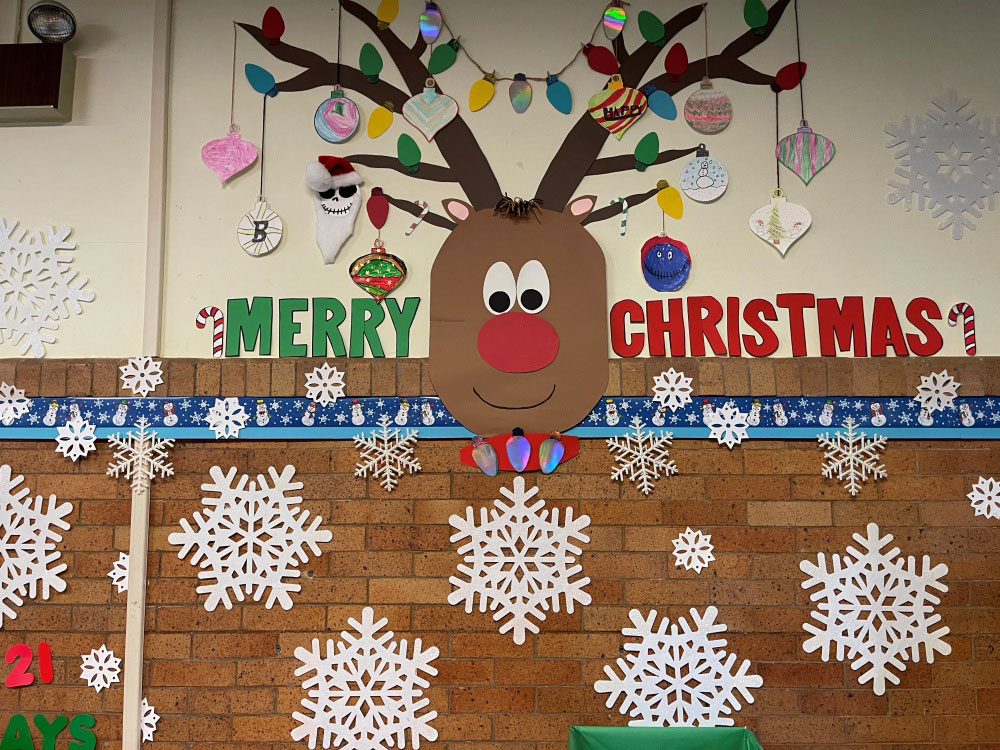 This year’s central focus is a Nativity scene, with Santa bringing a gift and kneeling before the baby Jesus. The white paper figures are flanked by palm trees, with the buildings of Bethlehem not far off. Angels, doves and stars can be seen above. The decorations cover all three floors of the 110-year-old brick school building.
