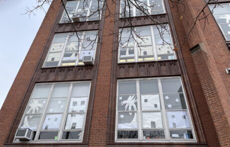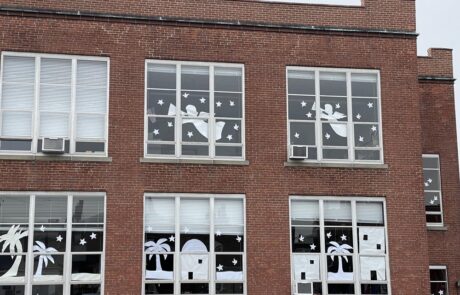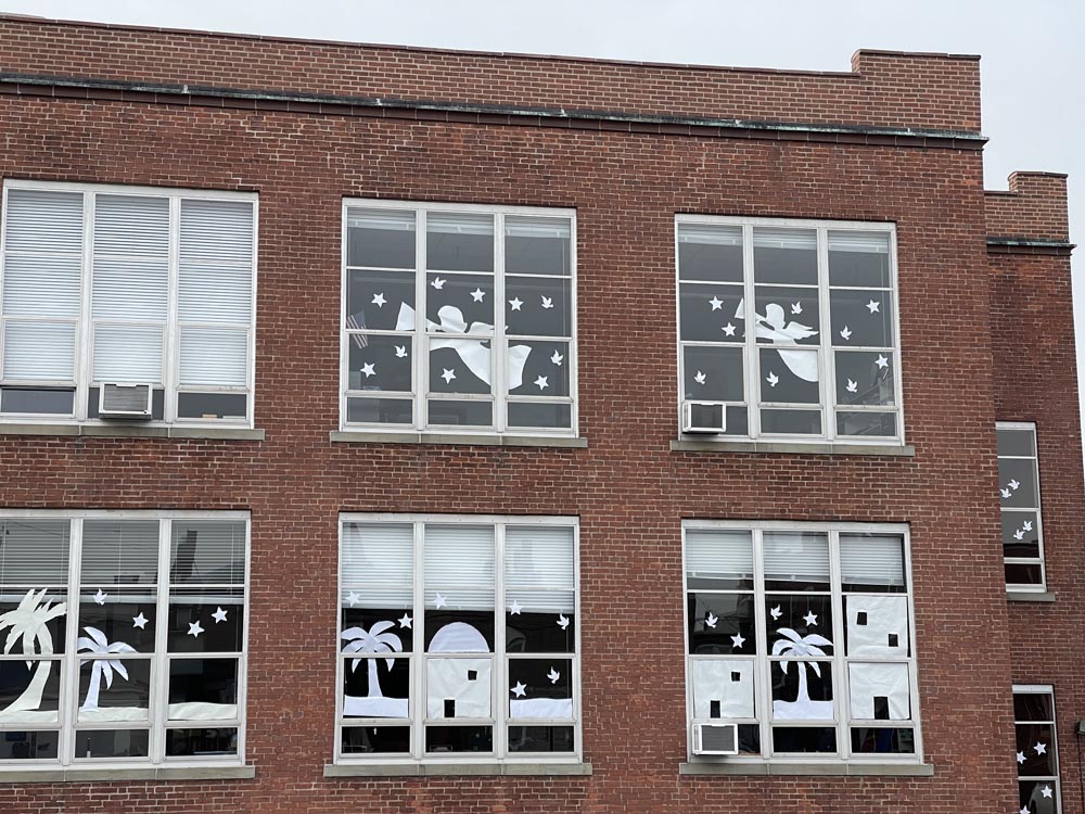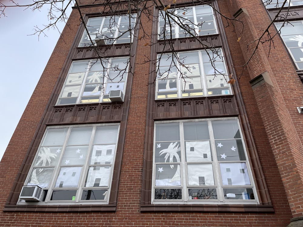 The decorations, which take a few weeks to put up, eventually fill all the windows of the school, from the front of the building, facing west, to the playground side, facing east. Even the stairwell windows are filled with stars. The playground side is visible from the town center.
