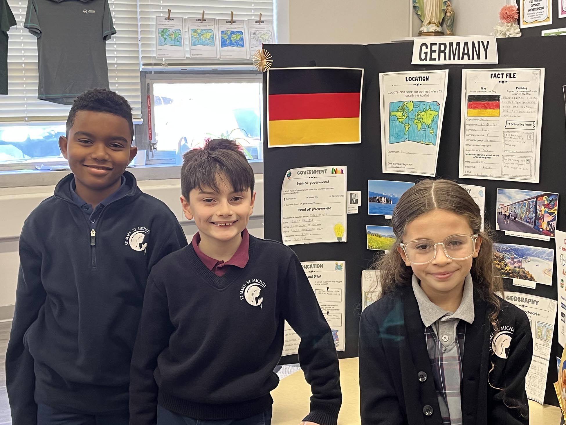 Fourth graders Darius, Liam and Delia, left to right, show off displays about Germany they worked on for a schoolwide project, Around the World, sponsored by St. Mary-St. Michael School in Derby. PHOTO BY KAREN A. AVITABILE