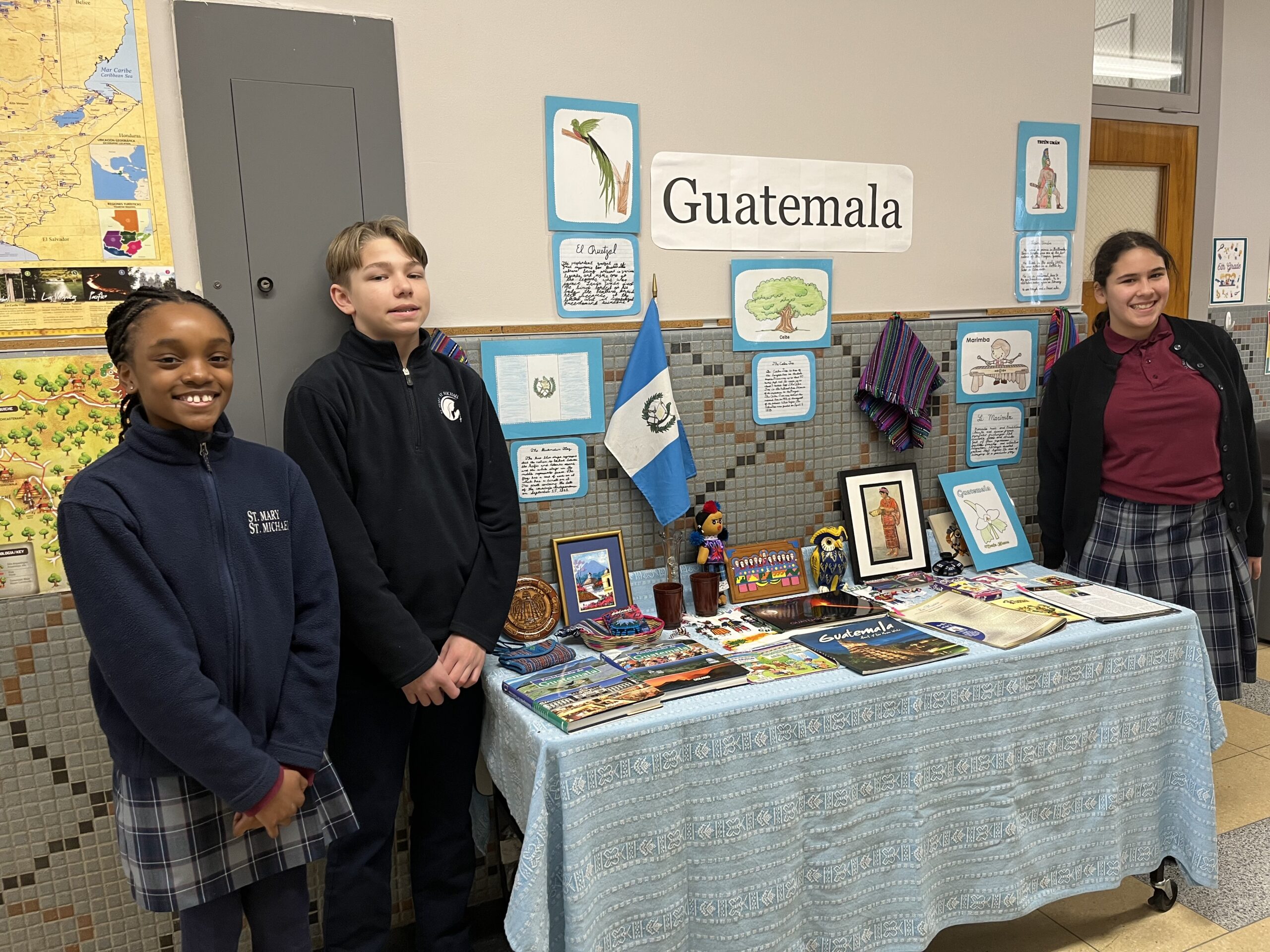 Zarah, Jude and Ava, left to right, stand by a display of Guatemala which includes pictures, books and information about the flag. Guatemala, a country in Central America, was chosen by sixth graders as their class project for Around the World at St. Mary-St. Michael School. PHOTO BY KAREN A. AVITABILE