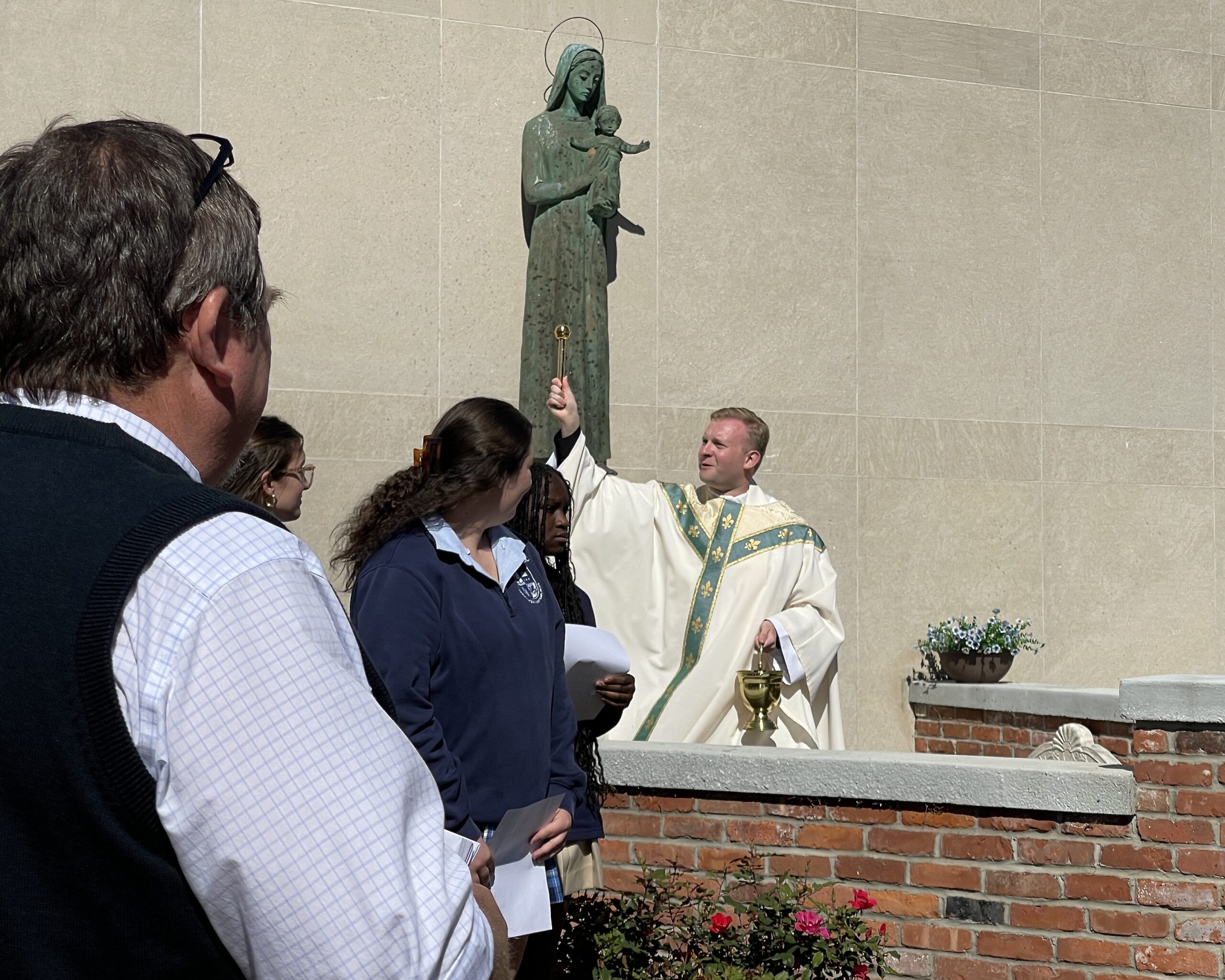 The focal point of the new grotto is a bronze statue of Mary holding the baby Jesus. Now mounted on the side wall of the school, the statue was rescued from the old Notre Dame convent, which existed on the school property until it was razed in 2021. Bricks taken from that same convent now form the lower walls of the grotto.