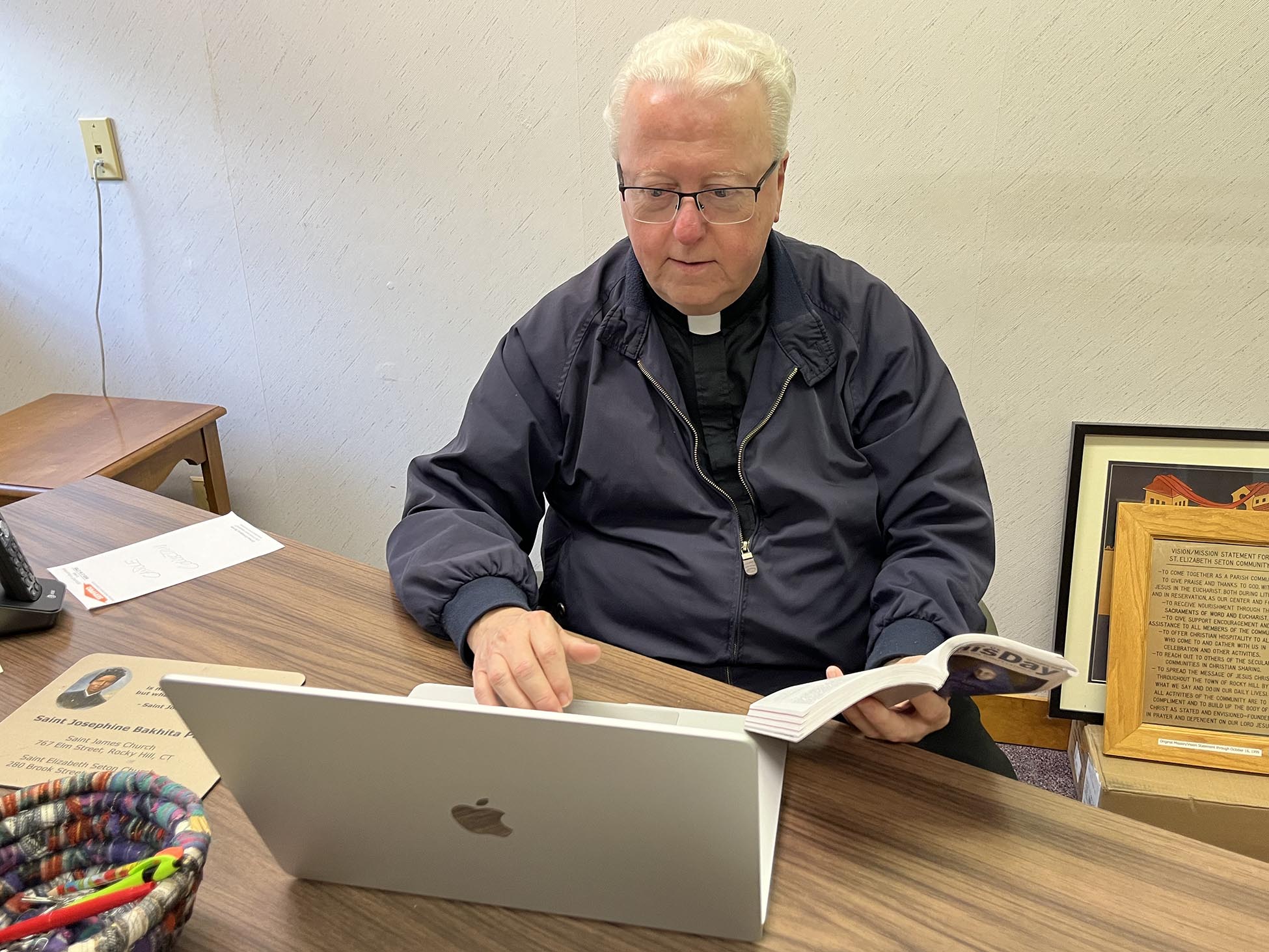 PHOTO BY KAREN A. AVITABILE Father George Couturier sets up his laptop to record a daily evening prayer on Facebook.