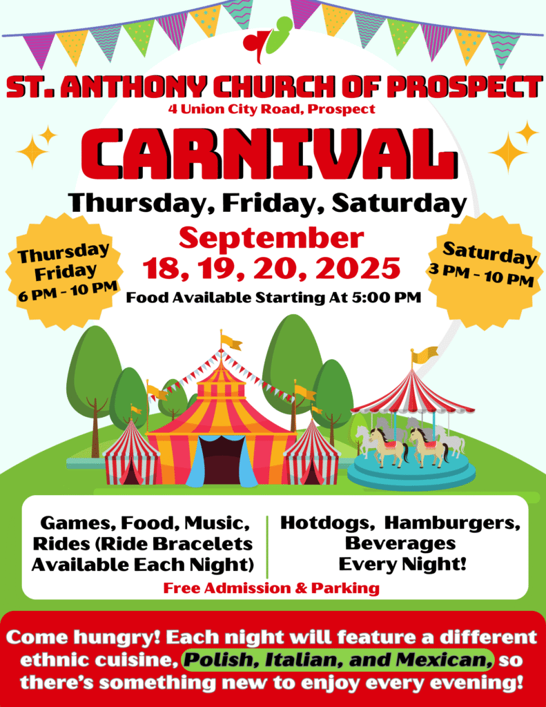 Prospect, CT – Get ready for three exciting nights of food, fun, and community spirit at the St. Anthony Church Carnival, taking place September 18–20, 2025, at 4 Union City Rd., Prospect, CT.