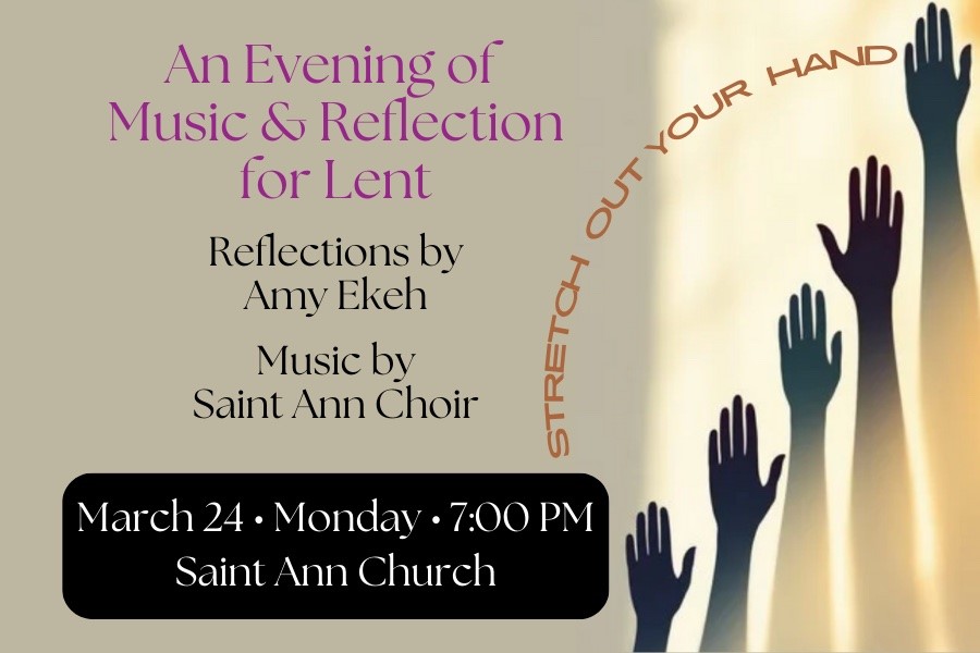 We are all in need of healing, whether of body, mind, or spirit. This Lent, can we come to God with radically open hearts, with our hands outstretched, willing to let God heal and renew us? Join Amy Ekeh and the Saint Ann Choir for a Lenten Evening of Music and Reflection on the theme of healing and hope. Be renewed, uplifted, and inspired with music, reflection, and prayer. No registration is required. All are welcome.