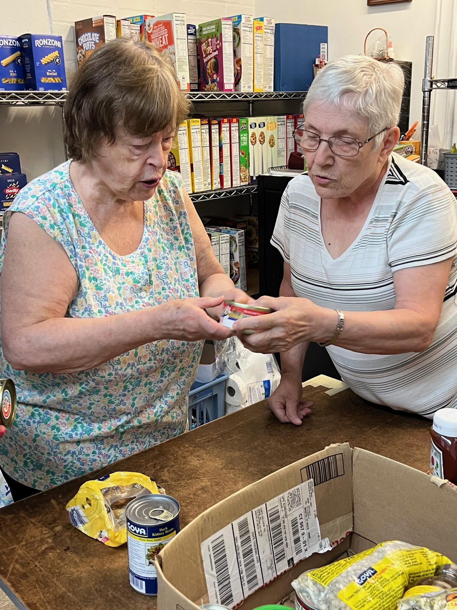 Volunteers of Mother Teresa Food Pantry look for the dates of canned food donations. PHOTO BY KAREN A. AVITABILE