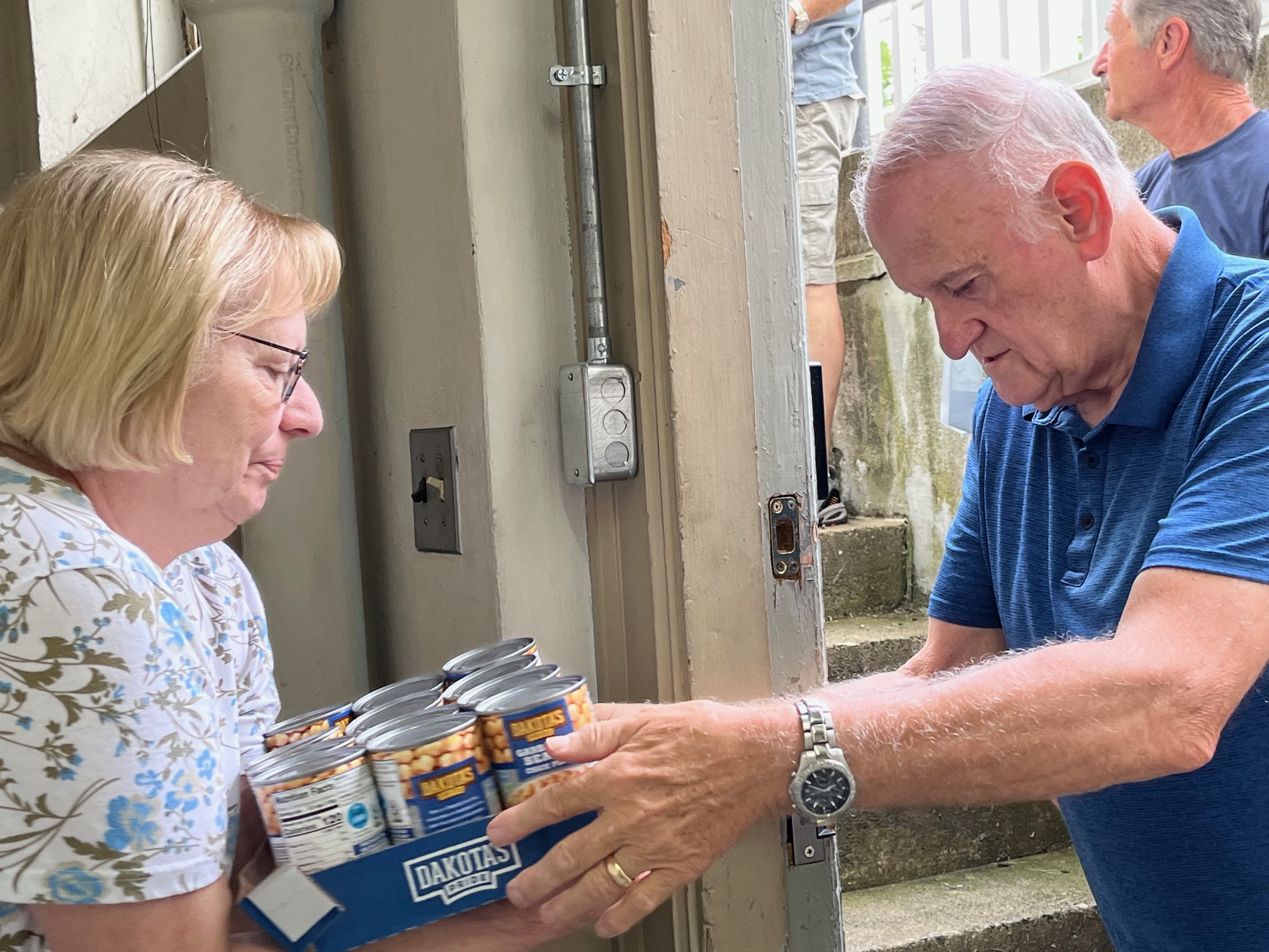 A case of canned food is carried in by volunteers of Mother Teresa Food Pantry which operates from St. Ann Church in Bristol. PHOTO BY KAREN A. AVITABILE
