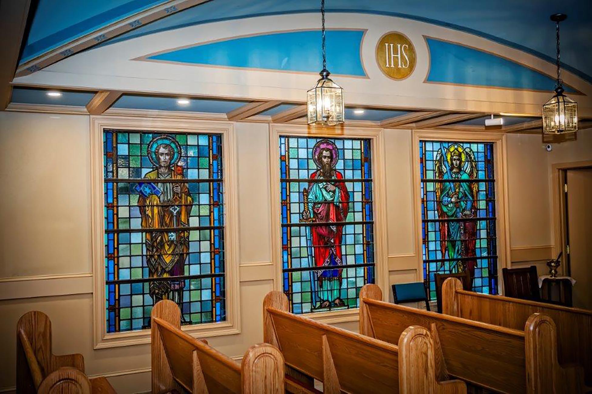The stained-glass windows that Father Dietrich speaks fondly of graced the original church building constructed in 1917. The new church was rebuilt on the property in 1987, with many artistic and historical components from the old church incorporated into the current one. These windows surround Blessed Sacrament Chapel.