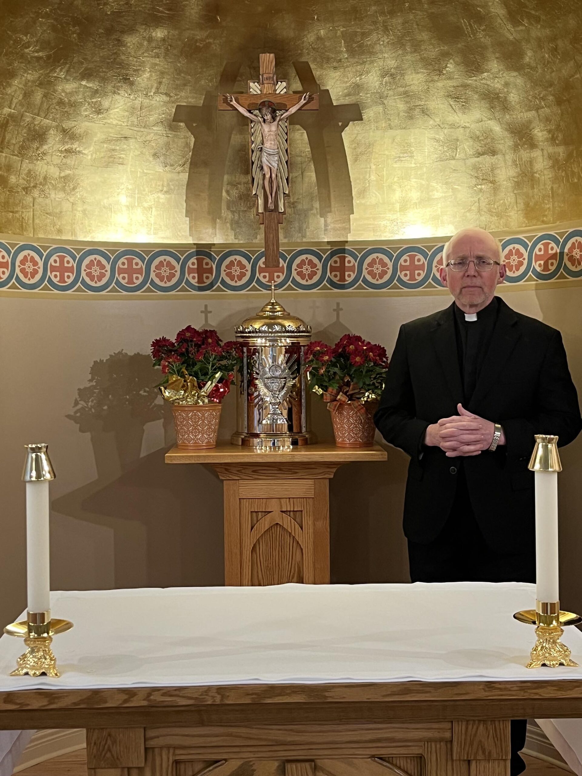 The crucifix on the altar has been restored, too. “It was cleaned and repainted, and it fits perfectly,” Father Dietrich says.