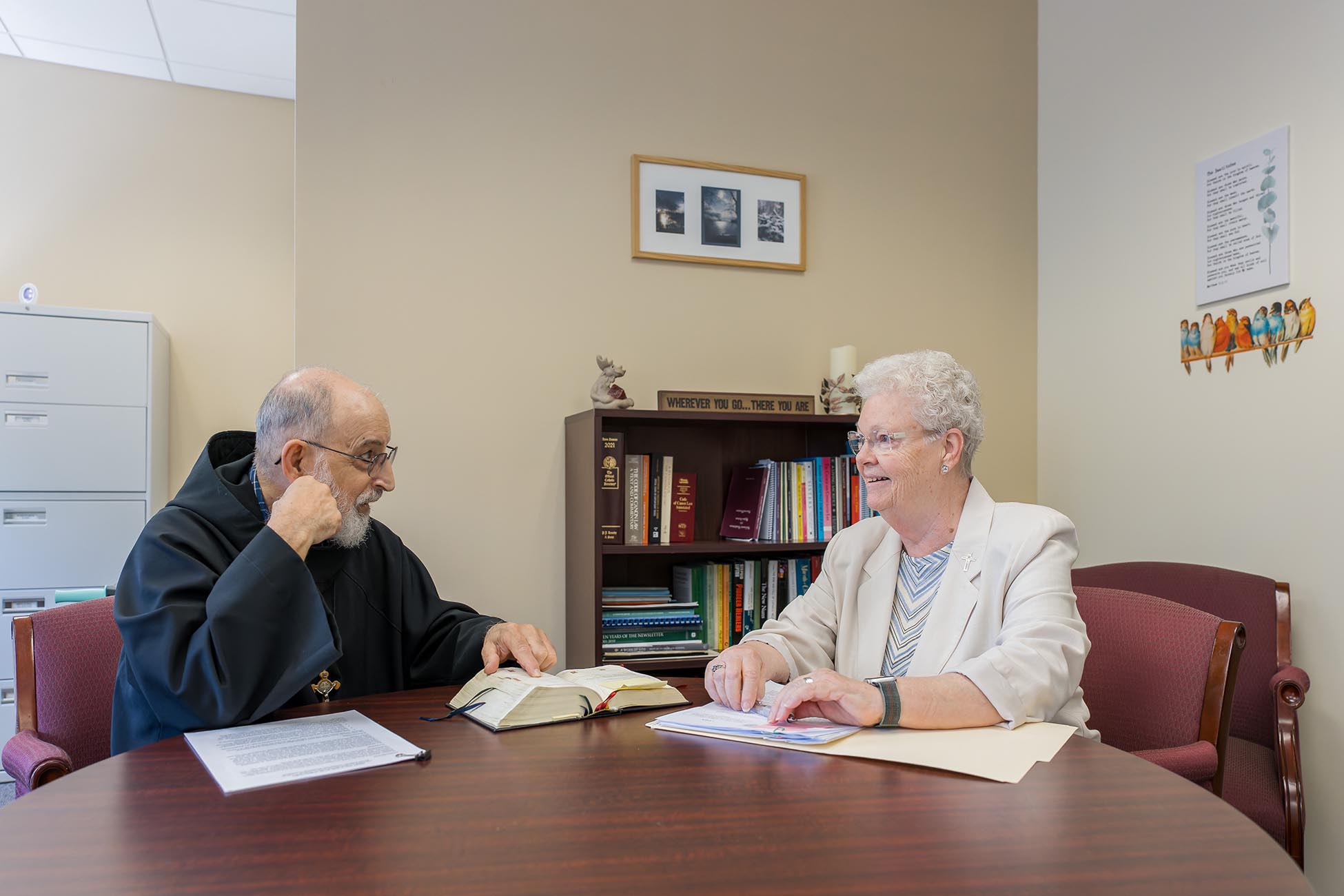 Sister Barbara Mullen, CSJ, appointed in January as the archdiocese’s new Delegate for Religious, offers ongoing spiritual direction to Blaise Falbo, a hermit for the Archdiocese of Hartford. (Photo by Aaron Joseph)