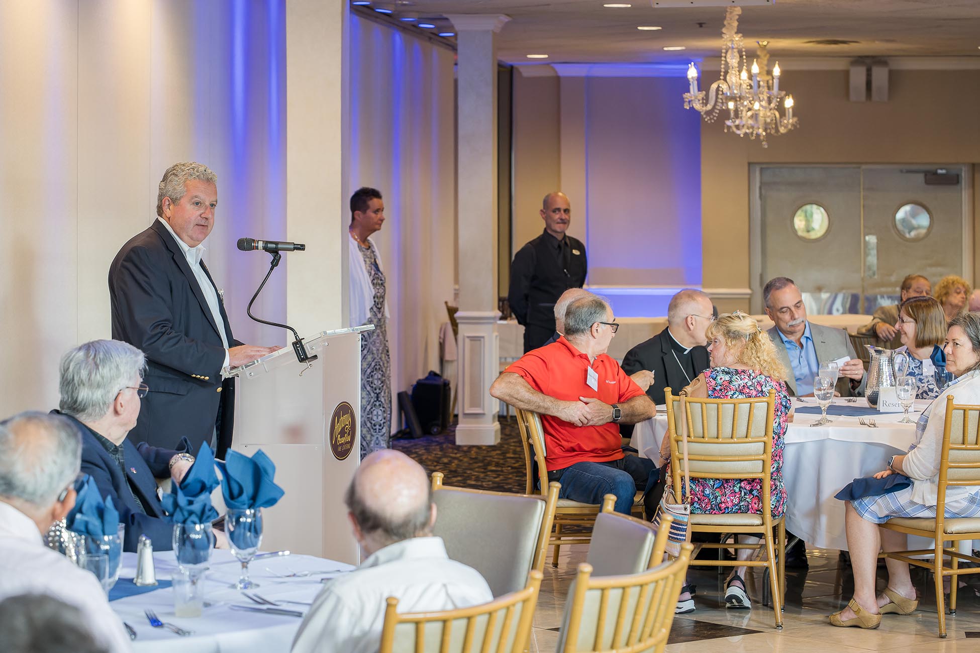 A social gathering for deacons and their wives in the Archdiocese of Hartford is held annually. At the gathering last June, Deacon James McCormack, director of the Permanent Diaconate for the Archdiocese of Hartford, served as the master of ceremonies. Deacons who reached milestone anniversaries of their ordinations were recognized and received lapel pins. Permanent deacons are single or married men, who are ordained by the archbishop to carry out a mission of service. The deacon’s ministry includes ministry of the liturgy, of the word and of charity. Deacons carry out their ministry in parishes and in special missions within the archdiocese. If you are considering a call to the Permanent Diaconate, call 860.242.5573.