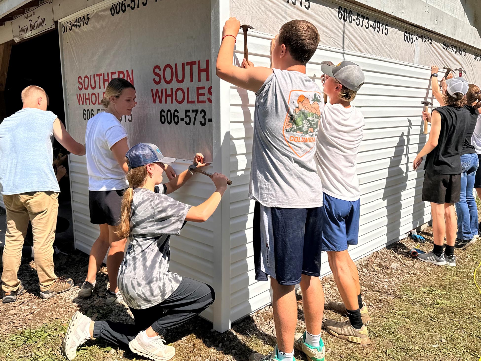 Teens from Our Lady of the Assumption Parish in Woodbridge and Bethany nail new siding onto a building that stores items for the food pantry at St. Stephen Parish in Cumberland, Ky. (Photo Courtesy of Father Glen Dmytryszyn)