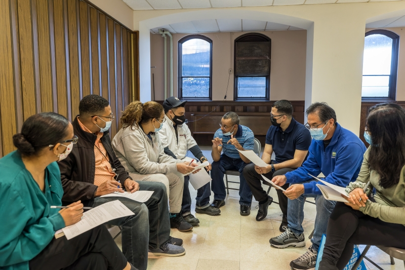 Parishioners in the parish hall at St. Lawrence O’Toole Church, part of Maria Reina de la Paz Parish in Hartford, participate in animated small group discussions during a Neocatechumenal Way catechesis session. Photo by Aaron Joseph