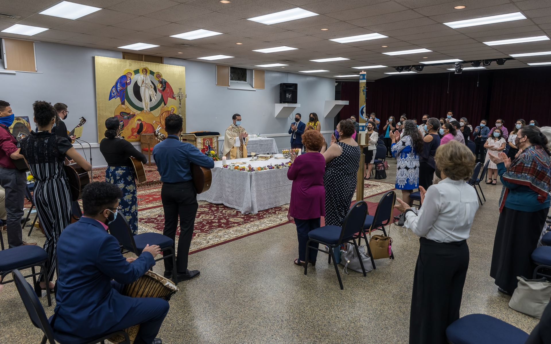 Neocatechumenal Way communities participate in a Mass celebrated on Saturday evening by Father Israel Rivera in the basement of St. Ann Church, part of St. Joachim Parish in New Britain. Photo by Aaron Joseph