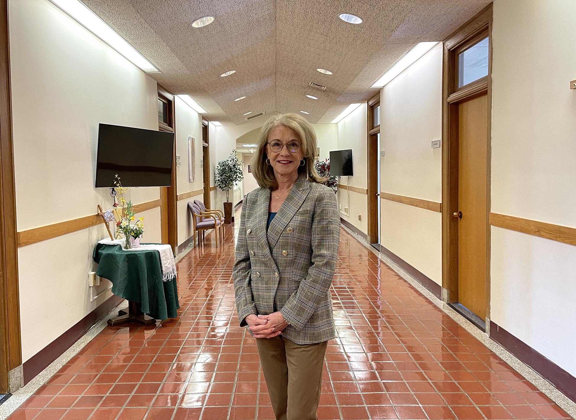 Valerie St. Jean, archdiocesan coordinator of Adult & Family Life Ministries, poses outside of her office at the Pastoral Center in Bloomfield.