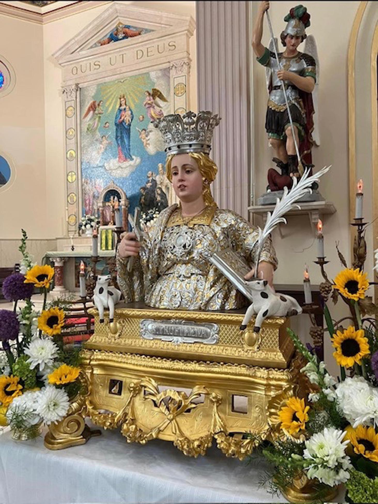 A statue of St. Trofimena was adorned by candelabras and flowers last weekend and placed on the altar of St. Michael Church. This statue can be seen year-round in St. Andrew Chapel, housed within St. Michael Church.