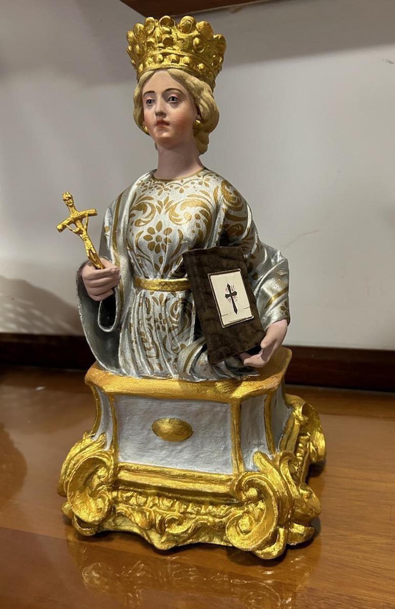 Deacon Ernie Scrivani of Blessed Michael McGivney Parish recently restored this statue of St. Trofimena, one of two on display last weekend in St. Michael Church. This particular statue was restored by Scrivani after a parishioner discovered it in a basement. During a recent visit to Minori, Italy, Scrivani and his wife Louise visited the basilica that bears St. Trofimena’s name. He points out that the saint is celebrated three times a year in the Catholic Church, including July 13, which commemorates an important miracle. While Minori was being attacked from the sea by Arab pirates centuries ago, villagers invoked the intercession of St. Trofimena, who summoned up a terrible tempest and shipwrecked the attacking horde. “I pray that St. Trofimena will intercede for us in our needs and help us to know and love our Lord more and more with each passing day,” Scrivani says. He adds that he feels drawn to her, and prays to her every day.