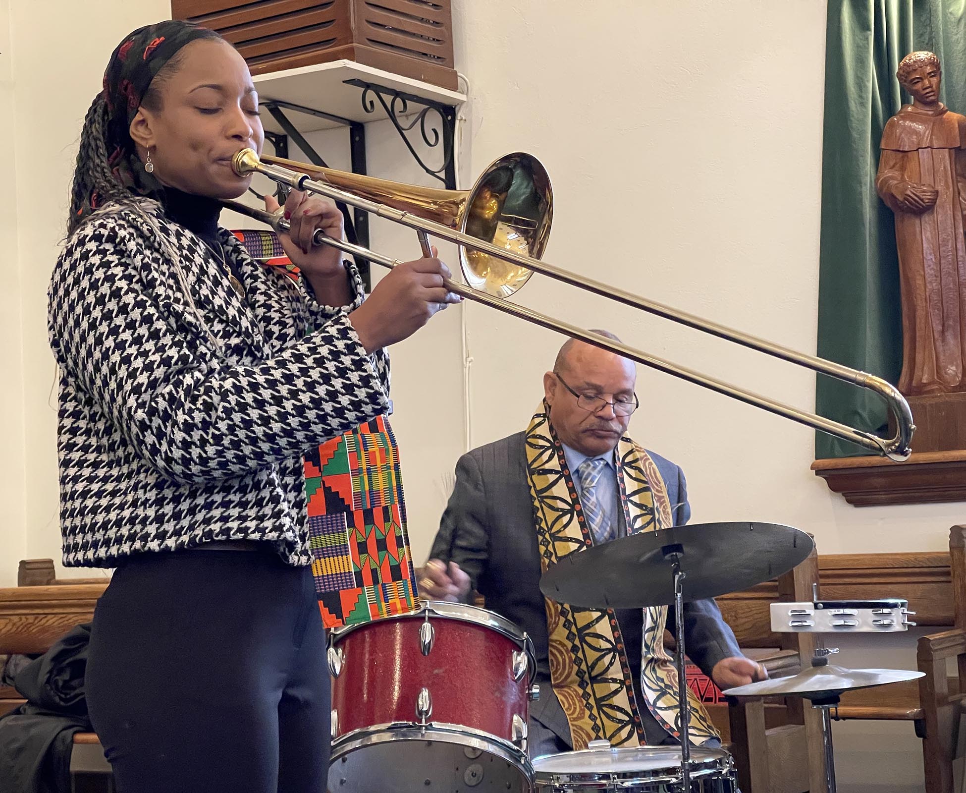 Yale trombonist Naomi Wharry plays an unexpectedly quiet instrumental meditation piece, accompanied by parishioner Leonardo Melendez on the drums. Photo by Shelley Wolf