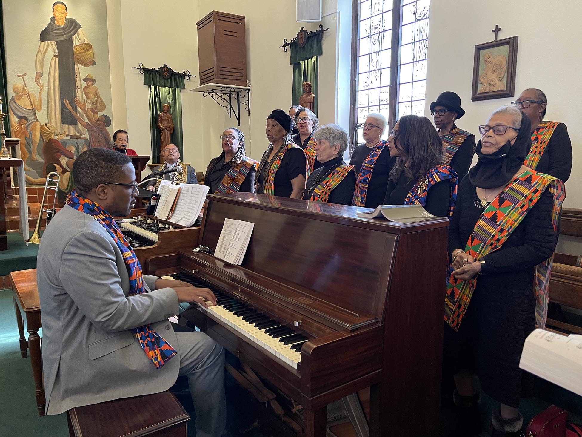 Choir Director Nelson Tamakloe plays the piano and leads the St. Martin de Porres Gospel Choir during the fourth and final Sunday celebration of Black History Month at St. Martin de Porres Church, part of Blessed Michael McGivney Parish, in New Haven. Photo by Shelley Wolf