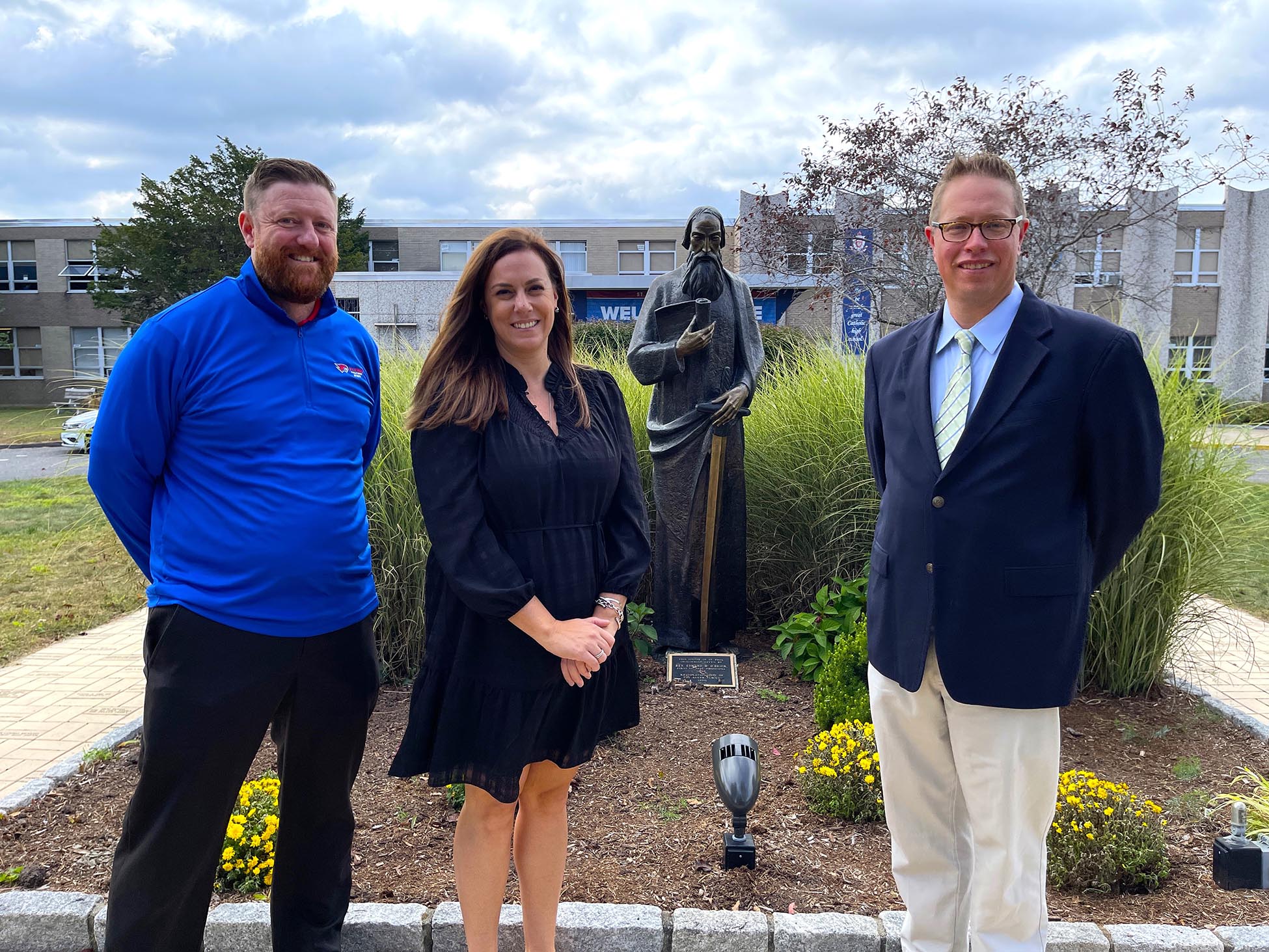 This school year, St. Paul Catholic High School in Bristol has a new leadership team. Standing outside the school beside a statue of St. Paul, from left to right, they are: Marc DiDominzio, dean of academic life; Susan Vassiliou, dean of student life; and James Cooper, president. Photo by Shelley Wolf
