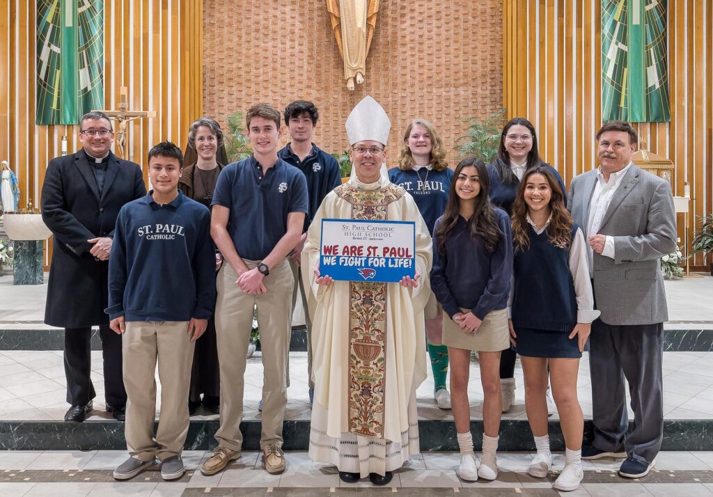 Auxiliary Bishop Juan Miguel Betancourt joins students from St. Paul Catholic High School after a Respect Life Mass at St. Gregory the Great Church in Bristol in October 2023. Father Joshua Wilbur, who is now administrator of St. Thomas the Apostle Parish in Oxford, is on the far left, Sister Mary Mercy Lee of the Franciscan Sisters of the Eucharist is in back, while Cary Dupont, now president emeritus, is on the far right. Photo by Aaron Joseph