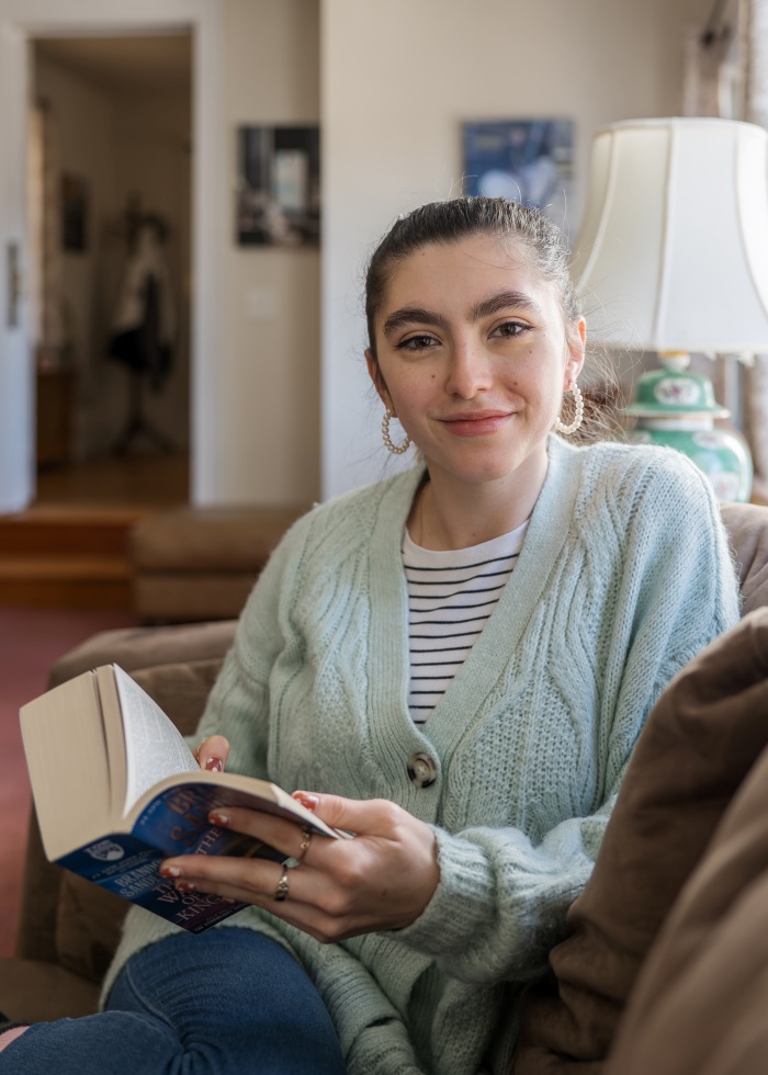 Julia Kudewicz takes a break from her studies at the Catholic Center at Central Connecticut State University, located near St. Francis of Assisi Church in New Britain. Julia was awarded the 2021 St. Joseph Archdiocesan Medal of Appreciation for helping St. Francis of Assisi Parish live stream the Mass during the early days of the pandemic. Photo by Aaron Joseph