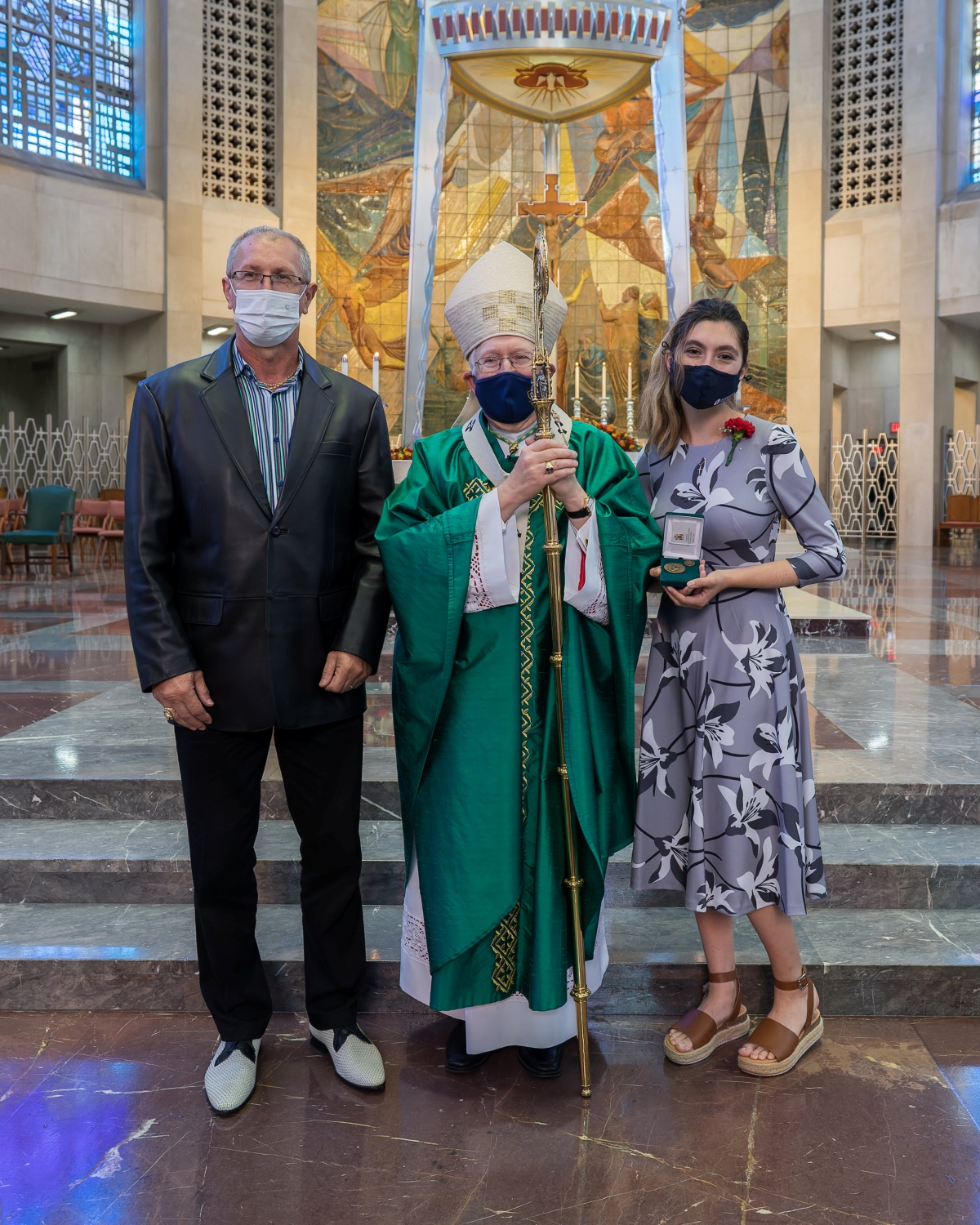 Archbishop Leonard P. Blair poses with Julia Kudewicz and her Father, Zdzislaw Kudewicz, after presenting Julia with the 2021 St. Joseph Medal of Appreciation at the Cathedral of St. Joseph in Hartford last fall. Photo by Aaron Joseph
