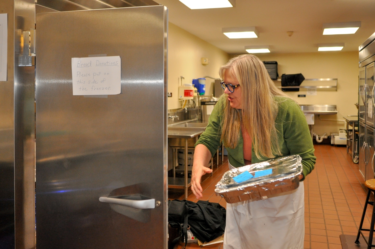 Nardone selects a pan filled with macaroni and cheese for reheating in the oven. The hot meal will be distributed to a homeless shelter in Hartford. Photo by Shelley Wolf