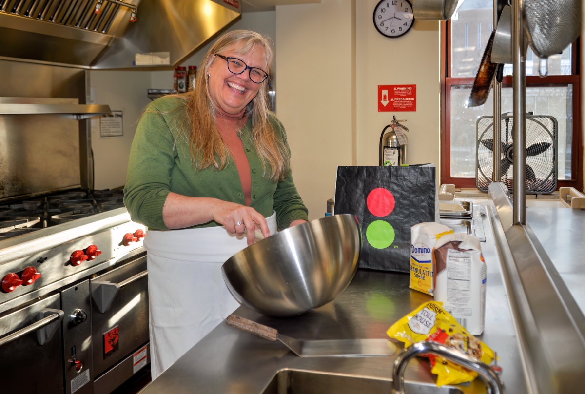 Kimberly Nardone, a parishioner at St. Patrick – St. Anthony Parish in Hartford, whips up a batch of chocolate chip cookies for distribution to the homeless and low-income families through the “sandwich window” at the parish’s Franciscan Center for Urban Ministry. Photo by Shelley Wolf