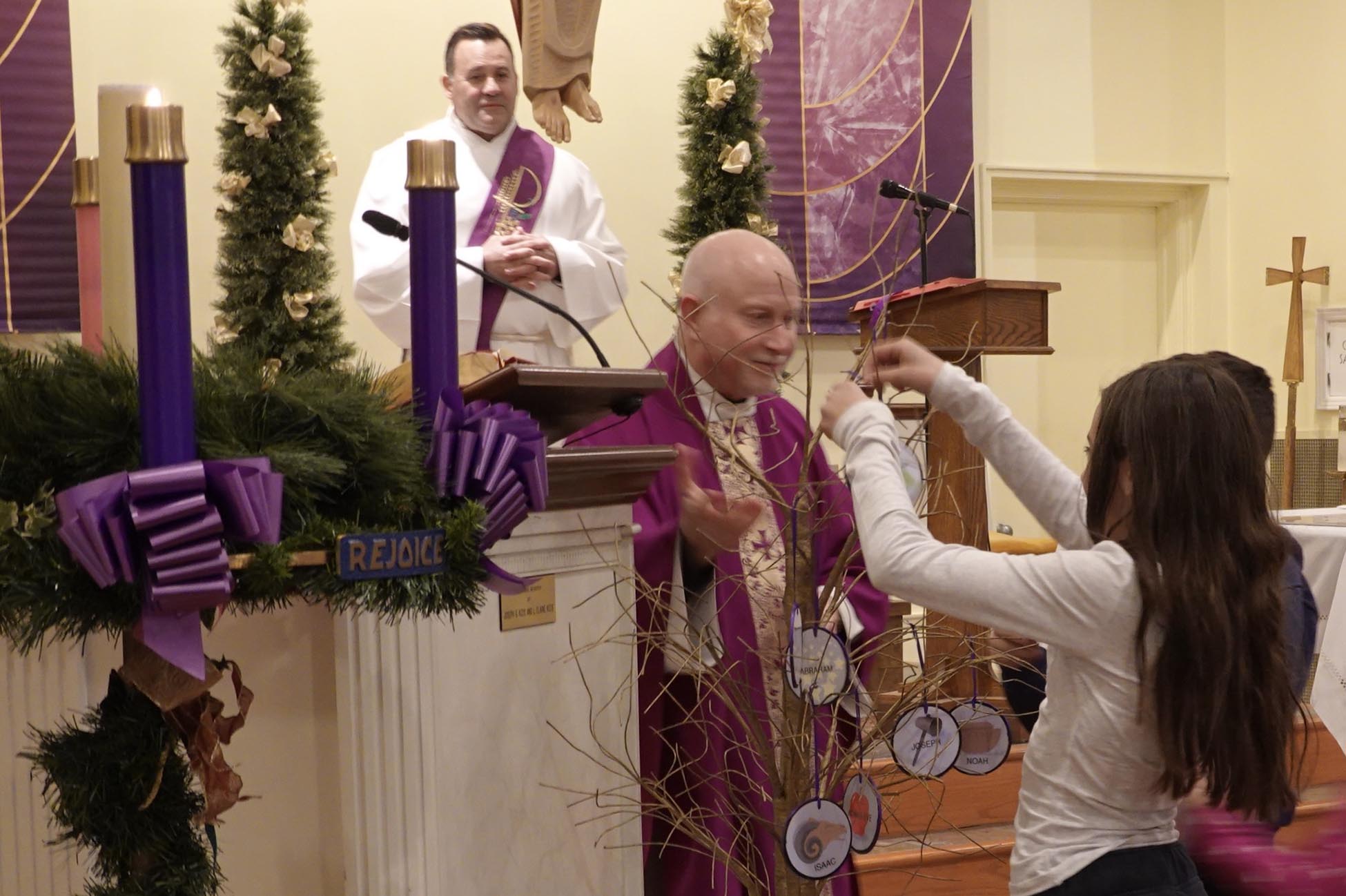 On the second Sunday of Advent, three children of the Ejlli family placed their ornaments on the tree — Kiara, 5, and twins Emma 10, and Elvin, 10. Kiara says that she was excited to be selected, and Emma says they had learned about the Jesse Tree in her Faith Formation class.