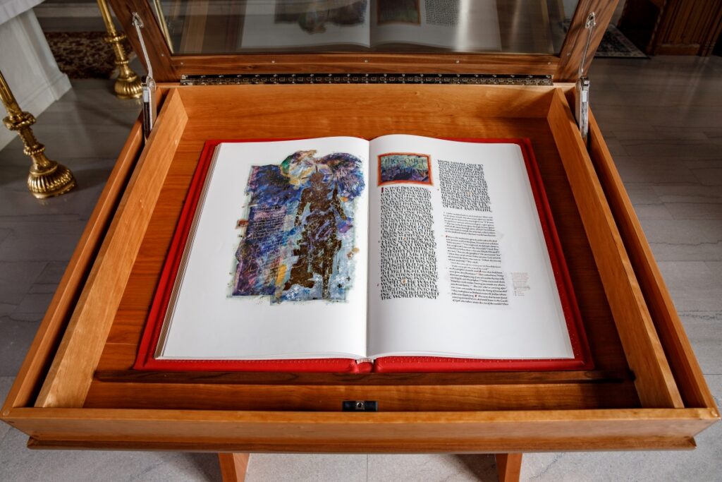 The beautifully illuminated book is Volume Six – Gospels & Acts, part of The Heritage Edition of St. John’s Bible.