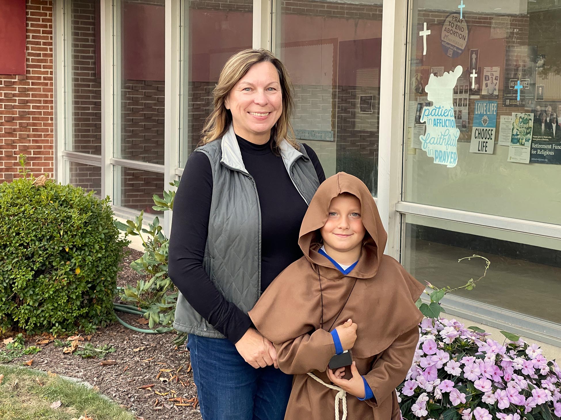 Jaxon Krzynowek, dressed as St. Francis of Assisi, joins his mother, Wieslawa Krzynowek, for the “Saints Retreat” at Our Lady of Mercy Parish in Plainville.
