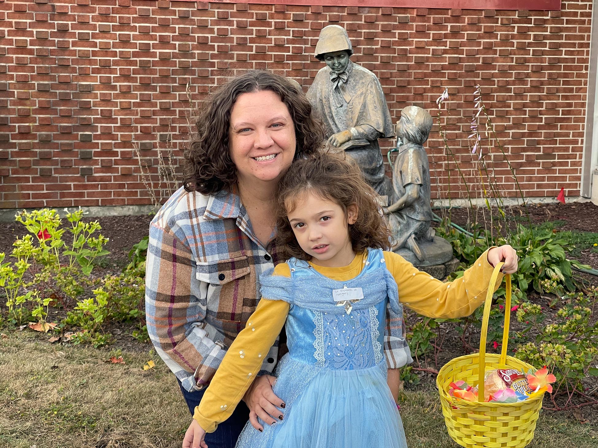 Madelyn Sweeney, dressed as St. Elizabeth of Hungary with a basket of bread and roses, is accompanied by her mother, Melissa Sweeney.