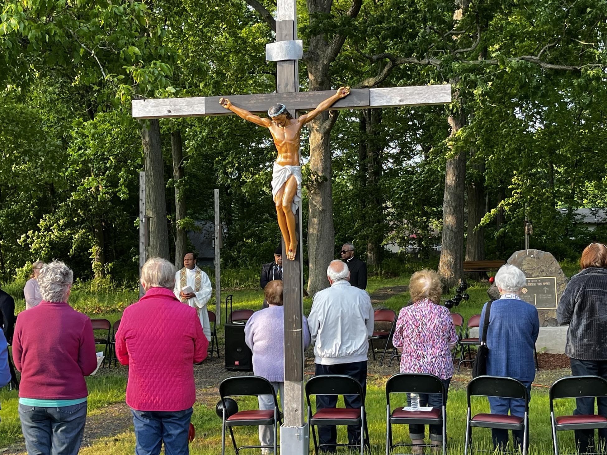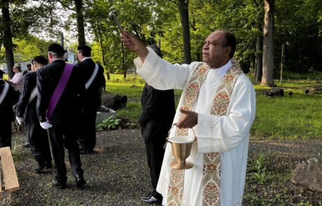 Father Dominic Anaeto, pastor of Our Lady Queen of Angels Parish, and Father Augustine Okoroafor, chaplain of the Silver City Council who resides in the Diocese of Bridgeport, recently blessed each Station of the Cross with holy water while followers recited the Lord’s Prayer and the Hail Mary.