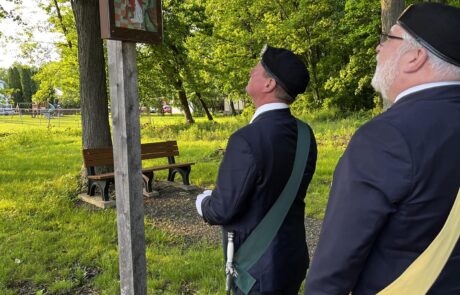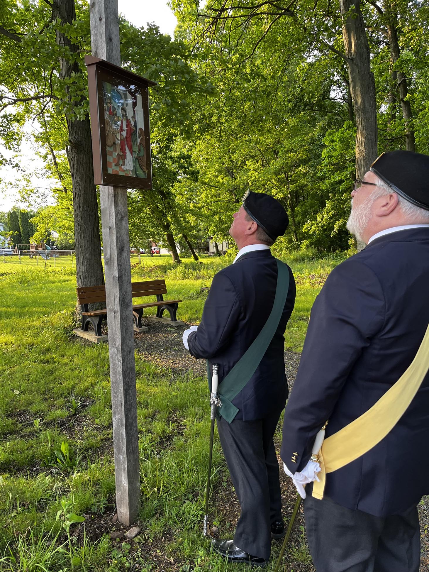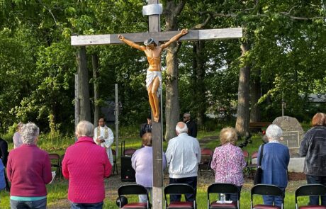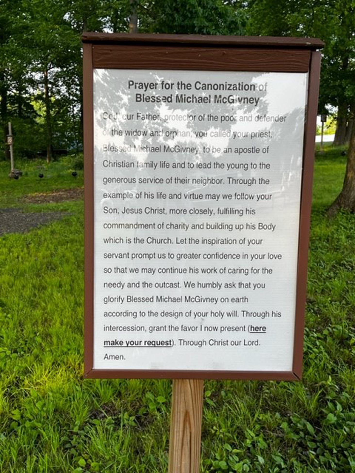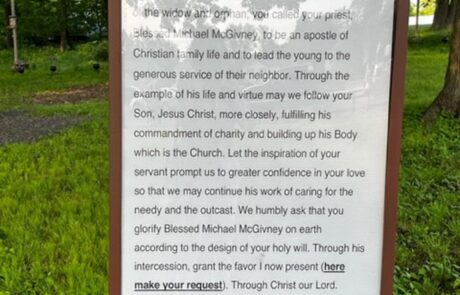 Today, the rosary path consists of uniquely repurposed bowling balls for the black and red beads. The Stations of the Cross are situated in a circle. A large standing crucifix is located on the property in addition to a stone grotto, which can also serve as an altar in the center of the garden. The Prayer for the Canonization of Father McGivney and a painting of Blessed McGivney line the garden and greet visitors.