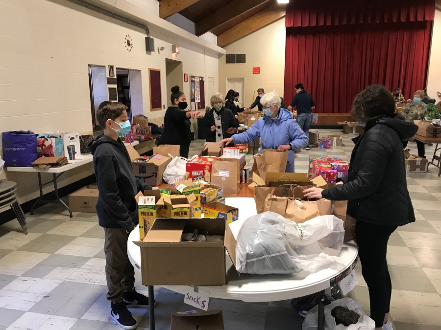 The project began last fall and concluded with a three-day packing event in January. The work involved moving hundreds of bags and boxes from the basement of a home to Sacred Heart Church hall, and setting up five assembly stations with all the items intended for the bags. Volunteers packed the bags with items such as hats, gloves, socks, toothbrushes, protein bars, cheese crackers, chicken salad, Cheez-its, juice boxes and prayer cards.