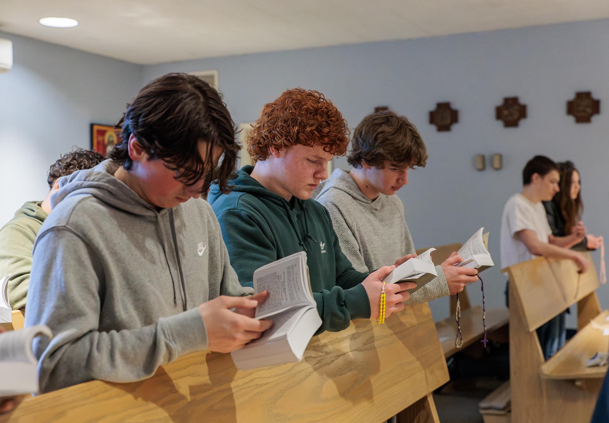 Members of the Tabernacle Society at East Catholic High School spend some quiet time in adoration in front of the tabernacle in the school’s Notre Dame Chapel.