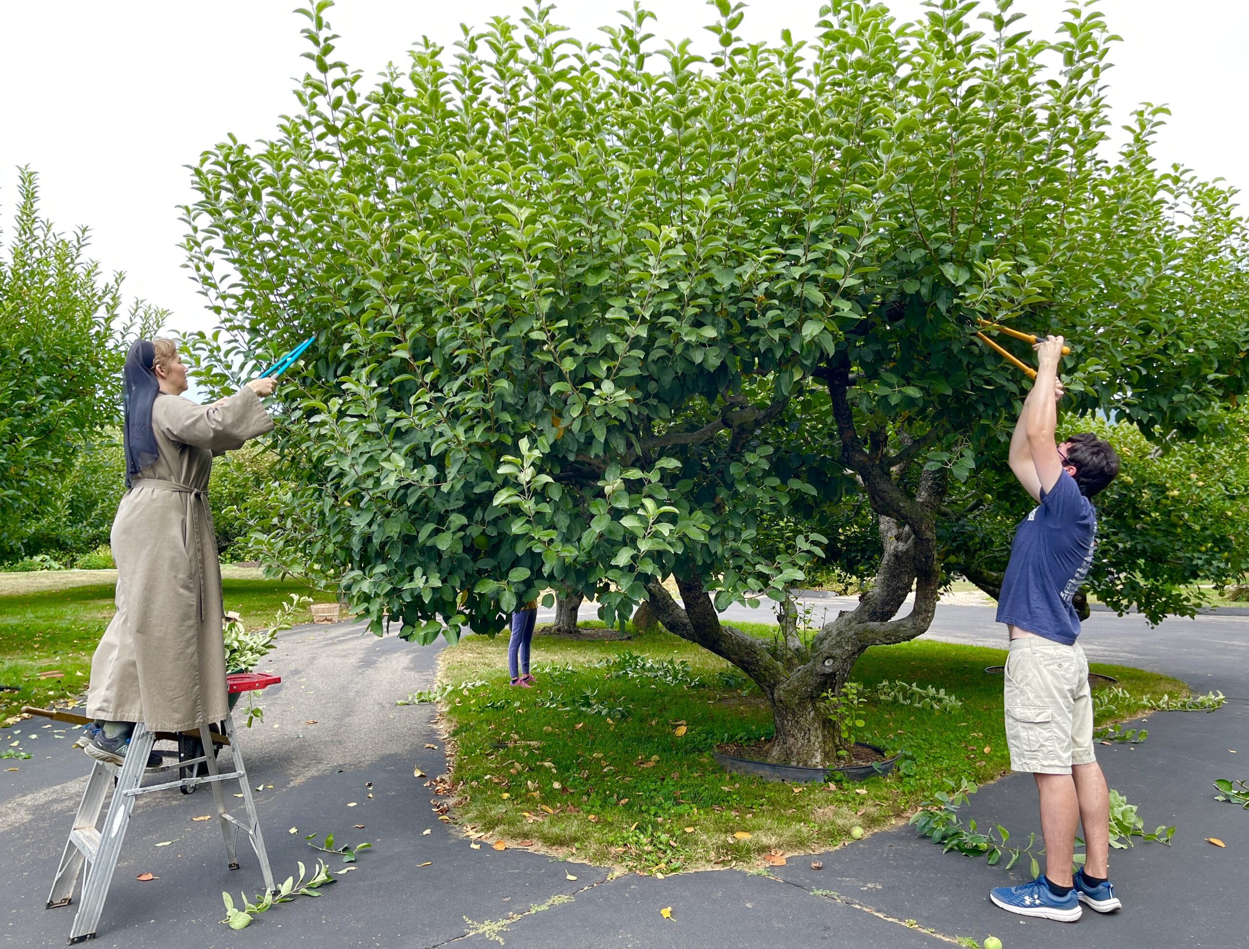 Sister Faith Marie Woolsey, of the Franciscan Sisters of the Eucharist, and volunteer Matthew Ennis work together to prune an apple tree. PHOTO BY SHELLEY WOLF